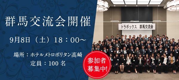 荷物を運んで欲しい人とトラック運送事業者を結ぶオンライン物流ネットワーク「トラボックス」(URL:http://www.trabox.ne.jp)を運営するトラボックス株式会社(本社・東京都渋谷区、代表取締役・吉岡泰一郎)は平成30年9月8日に、JR高崎駅西口直結のホテルメトロポリタン高崎にて、運送会社様にご参加いただく「群馬交流会」を開催いたします。