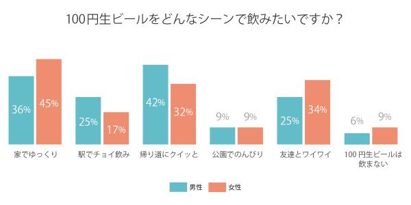 ■100円生ビールを飲みたいシーンは「帰り道にクイッと」男性42%、女性32%