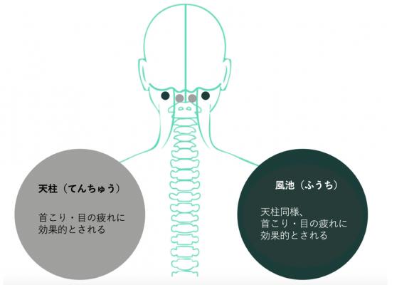 首筋にある以下のツボに効果的に働きかけ、首や肩のコリを緩和してくれます。集中しすぎて頭が重いとき、疲れから首を頻繁に回してしまうときなど短時間でその疲れをリフレッシュできます。