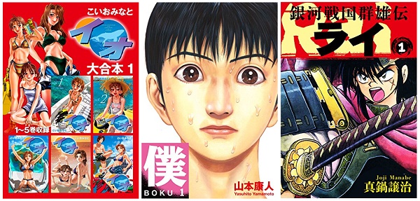 今回割引対象となるタイトルは、2018年8月の【コミック】書籍のダウンロード数ランキング(集計対象ストア:Kindleストア、楽天Kobo電子書籍ストア、Google Play、iBooks、SONY Reader Store、Yahoo!ブックストア)で1位に輝いた『イオ 大合本』(こいおみなと=作)、2位の『僕 BOKU』(山本康人=作)、3位の『銀河戦国群雄伝ライ』(真鍋譲治=作)の計3作品です。