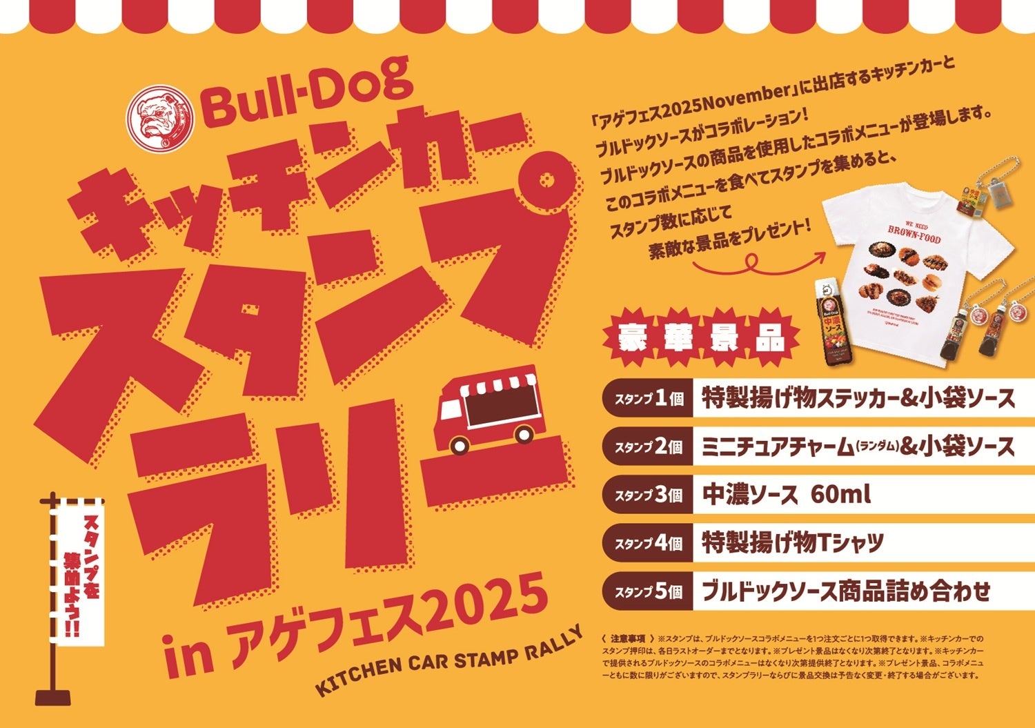 「アゲフェス2025November」に出店するキッチンカー5店舗で提供されるブルドックソースとのコラボメニューを食べてスタンプを集めると、スタンプの取得数に応じて豪華景品をプレゼントいたします。