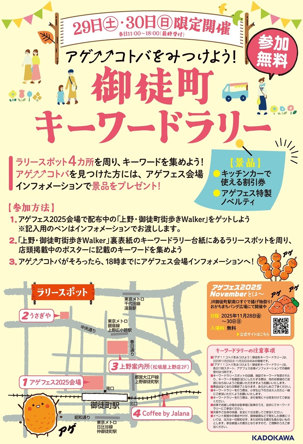 ※「アゲ↑↑コトバをみつけよう!御徒町キーワードラリー」は、2025年11月29日(土)・11月30日(日)のみの開催となり、各日11時スタート、アゲフェス会場インフォメーションでの最終受付は18時です。