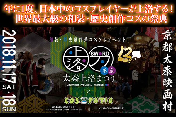 キャラクターコスチュームやグッズの製作・販売を行う株式会社コスパは、「太秦上洛まつり(主催:太秦上洛まつり実行委員会)」において、2018年11月17日(土)、11月18日(日)に京都府の東映太秦映画村にてコスプレイベント『COS-PATIO in 太秦上洛まつり』を開催することを発表。今回お報せするのは、「コスパティオ」ブランドより、イベント情報となります。