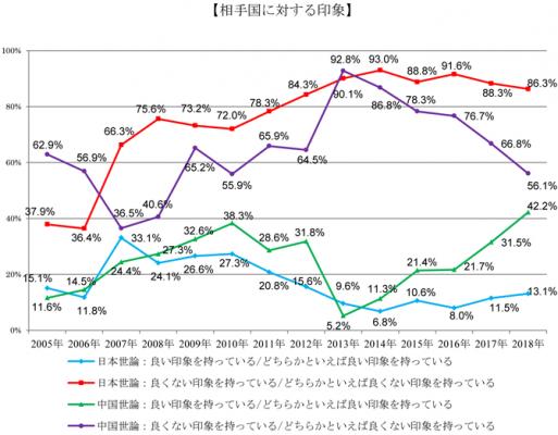 中国人の、日本に対する印象の改善は進み、日本の印象を「良い」とする人は昨年から11ポイント増加して42.2%となり、2005年の調査開始以降で最も高い数値となった。これに対して、「良くない」が11ポイント減少し、56.1%にまで下がっている。