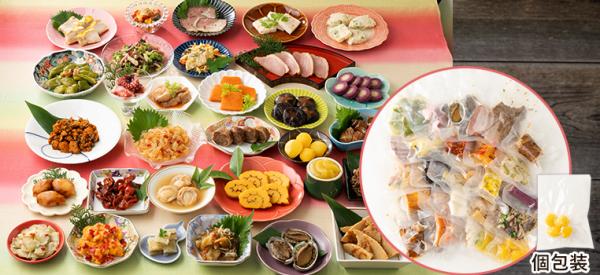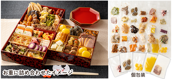 しょうざんのおせちを取扱いはじめて15年。お重に入って冷凍されているおせちが主流でありますが、お重は以外と高いと思われている方やお重は自宅にあるので商品だけを希望される方へしょうざん創業70周年の特別企画として、しょうざんの特徴を活かした和・洋・中の人気商品をお重につめずに1種類ずつ真空パックしたオリジナルおせちを企画しました。
