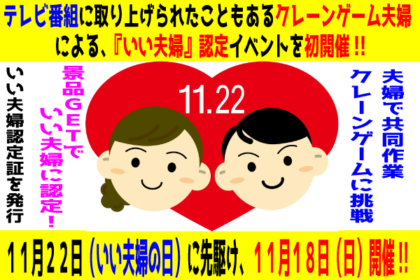 そんな30年以上、仕事でもプライベートでも苦楽を、共に歩んできた当社の『クレーンゲーム夫婦』こと中村夫妻による、クレーンゲームを通した【いい夫婦認定イベント】を行います。
