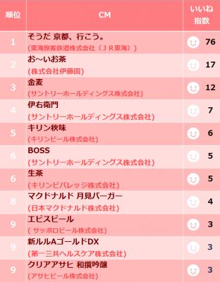 CMランキング/アンケート発表・紅葉の季節に合うCMトップは「そうだ京都、行こう。」2位以降は飲料CMがほぼ独占!ユーザーコメントも公開/CM-TVRider;tv-rider.jp