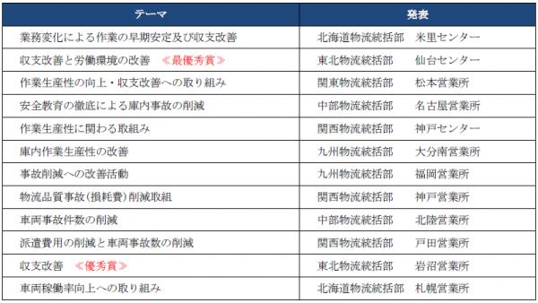 最優秀賞の仙台センターは、様々な課題の根本的な原因を『人員が安定しないことが生産性の不安定化に繋がり、負のスパイラルを起こしている』と仮定。職場環境改善のために、作業の標準化・業務管理強化などに取組み、不採算部門の収支の回復や労務費・派遣費の削減に成功しました。発表者は、「今回の改善活動を通して、いかに職場改善をしていかなければ、作業改善・収支改善に繋がらないかを痛感した。」と述べました。