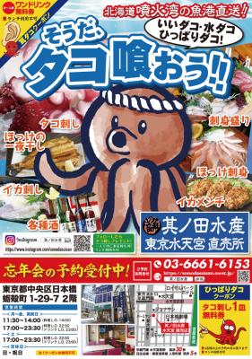 ・いいダコ・水ダコ・ひっぱりダコ!そうだ。タコ喰おう!!をキャッチに、今が旬のタコをはじめ、東京ではあまり食べられないホッケの刺身や、イカ刺し等の北海道直送の新鮮な魚の旨さを味わって欲しい!