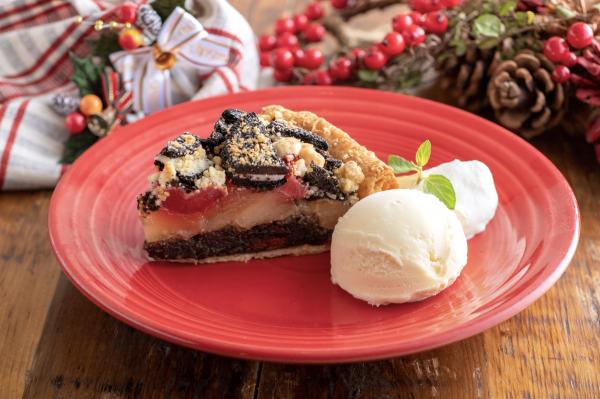 たっぷりのりんごにコーヒークリームとチョコレートを合わせた、カフェモカ風味のクリスマス限定アップルパイ「クッキー&カフェモカの クリスマス アップルパイ」が期間限定で登場致します。クランブルとココアクッキーサンドを乗せたアメリカンなビジュアルが可愛らしい、この時期しか出会えないアップルパイをお楽しみください。