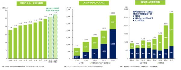国土交通省の発表によりますと、日本人のクルーズ旅行者数は2017年に31.5万人(前年比27%増)と過去最高を記録するなど、国内需要も拡大傾向にある一方、中国を中心としたアジア市場、また、日本へのインバウンドクルーズ人口も2017年に253.3万人(前年比27%増)となるなど、それを上回る規模の成長を見せております。