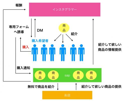 企業や店舗が広めたいサービスや商品と、自分のInstagramでサービスや商品をアピールしたいインスタグラマーをマッチングするためのプラットフォームの運営がsapの目的です。クライアント様が宣伝したい商品を、インスタグラマーにオファーを出し、インスタグラマーに紹介してもらうことで販売促進につなげるわけです。