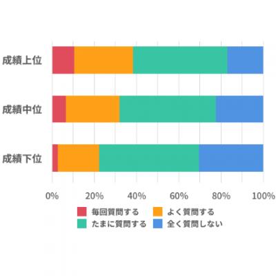 お子さんは疑問点があったら塾の先生に質問をするかについて、成績別にたずねました。成績上位の方が、より質問頻度が高いことが分かります。
