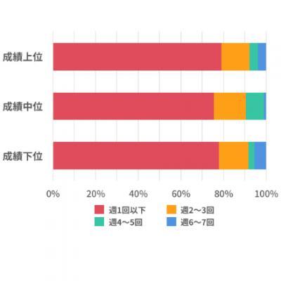 自習室の利用頻度はどれくらいかという質問については、成績別で大差はなく「週1回以下」という回答が大半を占める結果となりました。