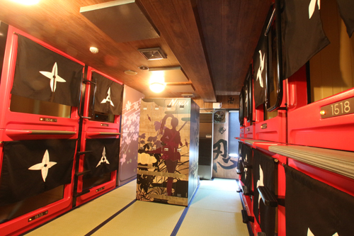 通常のカプセルルームの床はカーペットですが「忍」では畳を敷き、各カプセルのすだれには手裏剣のデザインを施しています。また、カプセル内には忍者のイラストや忍者文字などが描かれており、部屋全体が忍者を連想させる雰囲気になっております。