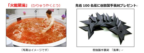 2月22日は忍者デーとして、大浴場の渦巻き風呂に唐辛子、生姜などの生薬を配合した入浴剤「火龍薬湯」を使用いたします。忍者の得意とする火炎術をイメージした火龍薬湯は唐辛子と生姜の発汗効果を最大限に活かした生薬薬湯です。冷え症、リウマチ、神経痛などでお悩みの方にオススメです。
