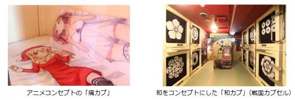 当館には「忍」以外にも様々なコンセプトを持ったカプセルルームがあります。抱き枕やシーツなどアニメのキャラクターを全面に打ち出した「痛カプ」や、戦国武将・花魁をテーマにした「クールジャパンフロア」は外国人の宿泊客に人気です。(「忍」もクールジャパンフロアの一部です)