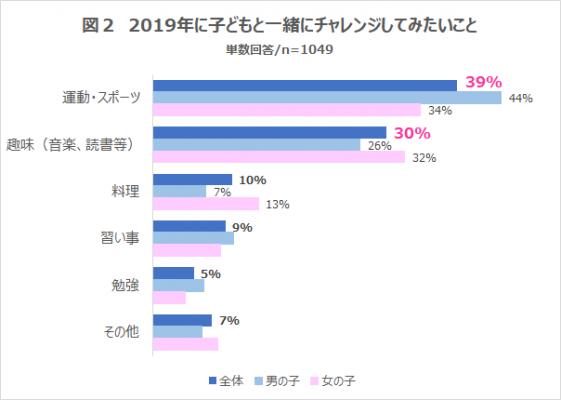子どもと一緒に2019年にチャレンジしたいことは、第1位「運動・スポーツ」で39%、第2位「趣味(音楽・読書等)」で30%、第3位「料理」で10%。子どもと一緒にチャレンジしたいことは子どもの性別により異なり、男の子のママパパの方が「運動・スポーツ」にチャレンジしたいという割合が高く、女の子のママパパの方が「趣味(音楽・読書等)」や「料理」にチャレンジしたいという割合が高い。この結果から、親として「男の子らしさ」や「女の子らしさ」を子どもに対して期待していることも読み取れる。