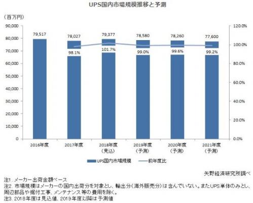 2017年度のUPS国内市場規模はメーカー出荷金額ベースで、780億2,700万円と前年度比で1.9%減と縮小するものの、2018年度は同1.7%増の793億7,700万円と僅かに拡大する見込みである。