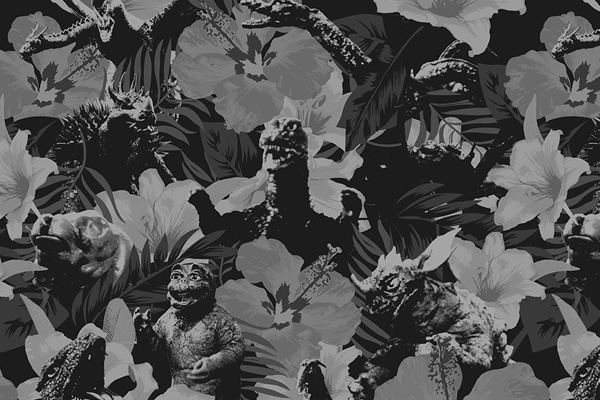 ▲アロハシャツならではの花柄の中には『怪獣総進撃』で活躍した怪獣たちが隠れています。