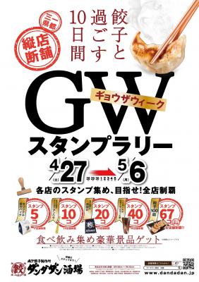 「肉汁餃子製作所 ダンダダン酒場」(https://www.dandadan.jp/)を運営する株式会社NATTY SWANKY(本社:東京都新宿区、代表取締役社長:井石裕二)では、スタンプラリーイベント「G.W.(ギョウザウィーク)スタンプラリー」を4月27日(土)から5月6日(月・祝)まで、東京、神奈川、埼玉、千葉の対象67店舗にて実施します。