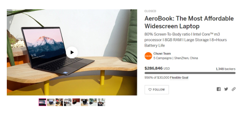 数か月前、CHUWIはIndiegogoでフルビューのノートPC「AeroBook」を発表しました。約1カ月間で1348名様の支援者様からの支援が殺到し、目標金額の956%までに達成し、大きな反響を呼び大成功を納めました。ノートPCがIndiegogoによる資金を集めて、CHUWIにとってこのようにいい結果を出したのは初めてのことです。Indiegogoプロジェクト終了後、「CHUWI AeroBook」が欲しいとのご要望が多数寄せられておりましたので、近い将来すべての主要プラットフォームで「CHUWI AeroBook」を販売する予定です。