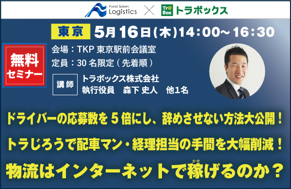 オンライン物流ネットワーク・トラボックスが、令和元年5月16日に無料の運送セミナーを船井総研ロジ株式会社と共催します。