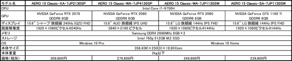 AERO 15 Classicシリーズの新モデルの主な仕様と価格は下記のとおりです。