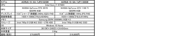 一方、CPUおよびGPUの冷却機構として6本のヒートパイプを採用したヒートシンクを採用するとともに、9つの空気孔を設けることで冷却性を高め、CPUとGPUの性能を最大限に引き出せるようにしたAORUS 15シリーズの新モデルには、CPUに6コア/12スレッドの第9世代Intel Core i7-9750Hを採用し、液晶パネルにはリフレッシュレート240Hz表示に対応したシャープ製フルHD IGZOパネルを採用した「AORUS 15-XA-7JP2132SW」と、GPUにNVIDIA GeForce GTX 1660 Ti 6GBを採用し、LG製144HzフルHD液晶と組み合わせたエントリーモデル「AORUS 15-SA-7JP1130SW」をラインアップします。