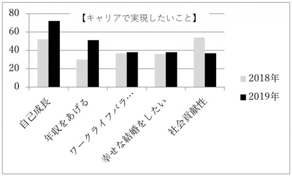 最も参加者の関心が高かったのは『キャリアで実現したいこと』を尋ねた項目の発表時です。昨年1位だった『社会貢献できる仕事に就く』の項目は、54%から37%まで低下し5位となりました。その一方で上位2位を占めたのは『自分の能力を高める、成長する』『年収をあげる』の項目で、どちらの項目も20%ほど増加し、72%と51%となりました。また3位と4位に変化はなく、『ワークライフバランスを確立したい』『幸せな結婚をする』という項目が38%となり、昨年と大きな変化はありませんでした。