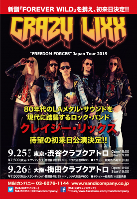 株式会社エムアンドアイカンパニーは、80年代のLAメタルサウンドを現代に踏襲するバンド「CRAZY LIXX」が新譜FOREVER WILDを携え9/25渋谷クアトロ、9/26梅田クアトロにて初来日公演を開催します。