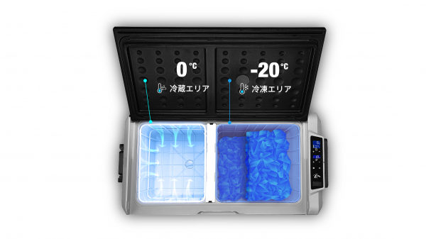 保存温度の異なるアイスクリームなどの冷凍食品と、フルーツや飲み物などの食材をそれぞれの適正温度で保冷するために、JUZCOOLは2つのゾーンで独立した温度管理が行えるようになっています。