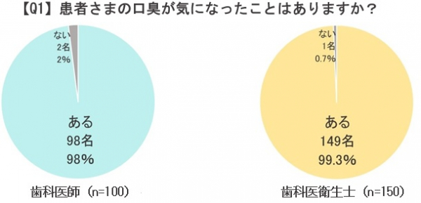 まず、「患者さまの口臭が気になったことはありますか?」と質問したところ、歯科医師98%、歯科衛生士99.3%が「ある」と答え、ほとんどの方が口臭を感じた経験があることがわかりました。