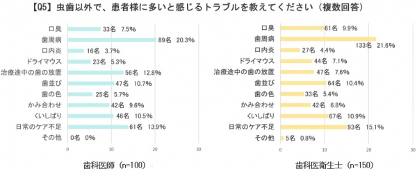 「虫歯以外で、患者さまに多いと感じるトラブルを教えてください」と複数回答で聞いたところ、歯科医師・歯科衛生士ともにもっとも多い回答は「歯周病」で、2位が「日常のケア不足」でした。以降、歯科医師の回答数順は「治療途中の歯の放置」「歯並び」「くいしばり」と続き、歯科衛生士の回答数順は「くいしばり」「歯並び」「口臭」という結果になりました。
