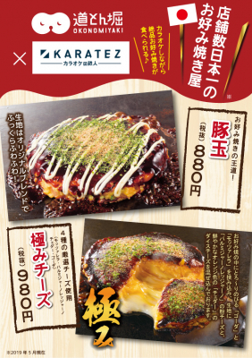 株式会社鉄人化計画(所在地:東京都目黒区 代表取締役社長:岡? 太輔)は、当社が運営する「カラオケの鉄人」の全55店舗において、「お好み焼道とん堀」などを全国に展開する株式会社道とん堀(所在地:東京都福生市 代表取締役:稲場 裕幸)のオリジナルレシピを再現したお好み焼き2種を2019年6月1日(土)から販売・提供します。