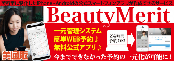 プロ向け美容材料の通信販売サイト「美通販」が、予約やシフトを一元管理!サロン様専用アプリが作成できる「ビューティーメリット」サービスをスタートしました。忙しいサロンワークをサポートするだけでなく、業務効率の向上や他店との差別化、集客力UPにも活用できる便利な新サービスとなっておりますので、この機会に多くのサロン様のお役に立てていただきたいと思っております。