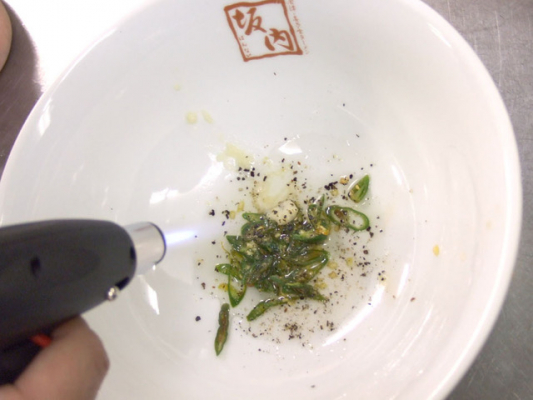 『青唐うま塩ラーメン・夏』が誕生した2010年には、真っ赤な激辛ラーメンがすでに市場に出回り人気になっていました。当社も、若年層への訴求強化を狙い激辛ラーメンの開発を試みましたが、従来と同様では他社商品の後追いになるだけです。「喜多方ラーメン坂内」の特長であるあっさりスープの旨味を活かした独自の激辛ラーメンが出来ないか試行錯誤を重ねました。その結果、商品開発部の宮田がこれまでの経験を活かし、パスタ料理「ペペロンチーノ」の辛さをラーメンに取り入れるという斬新なアイデアがひらめきました。味の決め手は、丼に刻んだ青唐辛子と、各店舗で手作りしている焼豚を仕込んだ際にできる“出来立てラード”を入れバーナーで1杯ずつ炙って作った、スッキリした辛味ラードです。セントラルキッチンを持たず、すべて店内調理にこだわった当社だからこそ可能な、青唐辛子の風味が活きた逸品です。一時期、冷たいメニューとして提供したこともありましたが、夏に汗だくで辛いラーメンを食べる需要の方が高く、現在は温かいラーメンとして定着しています。