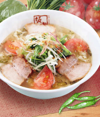 商品特長 :厳選した塩を使用した当社秘伝の“透明塩スープ”に、青唐辛子の辛さとお酢のやさしい酸味をプラスし、さっぱりとした辛さが特徴の期間限定メニュー。よくある真っ赤な激辛スープとは一味違う旨味と、スッキリ感のある衝撃の辛さがマッチした逸品。トッピングは、湯むきしたトマト・レタス・みょうが・玉ねぎ・ほうれん草の5種類の夏野菜や緑黄色野菜と、店舗仕込みの焼豚5枚で、栄養満点、ヘルシーな夏の味に仕上げています。
