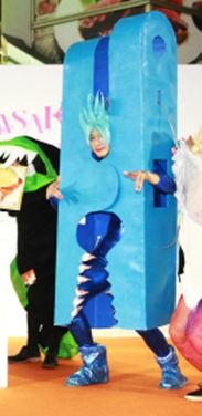 “洗濯バサミ”の着ぐるみを着た代表の西村