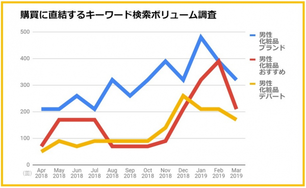「ブランド」「おすすめ」「デパート」を検索する消費者は、購入する商品を選択しようとしていたり、どこで売っているのかを確かめたりしていると推測できます。それらのキーワード検索ボリュームはこの1年で増加傾向にあり、消費者の男性化粧品の購買意欲も高まっているといえます。