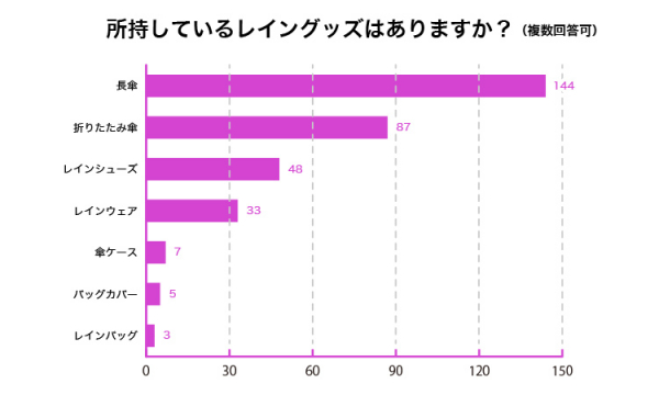 「レインシューズ」や「レインウェア」も、利便性やデザイン性の高いグッズが年々増加している影響か、所持している方が多い印象です。