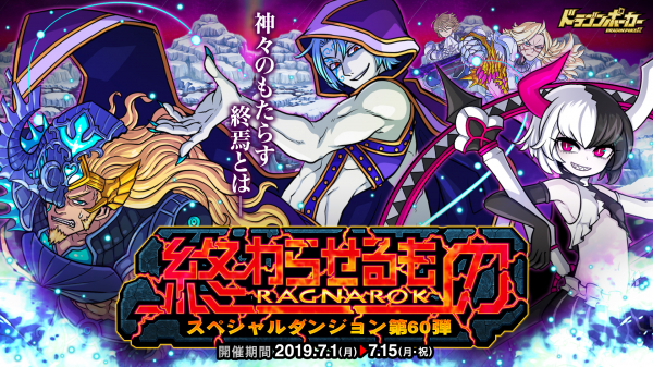 株式会社アソビズム(本社:東京都千代田区、代表取締役:大手智之)は、App Store・Google Playにて好評配信中のリアルタイム合体カードバトル『ドラゴンポーカー』で、2019年7月1日(月)より新スペシャルダンジョン「終わらせるもの RAGNAROK」を開催いたします。今回のダンジョンでは「終わらせのロキ」がボスモンスターとして登場!一緒に冒険する仲間と協力し、ダンジョンクリアを目指しましょう!