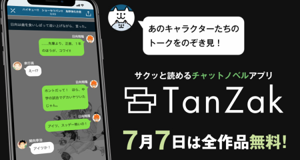 集英社による、出版社初のチャットノベルアプリ「TanZak(タンザク)」が、7月7日(日)の午前0時より、24時間限定の「全小説無料読み放題キャンペーン」を実施することになりました。