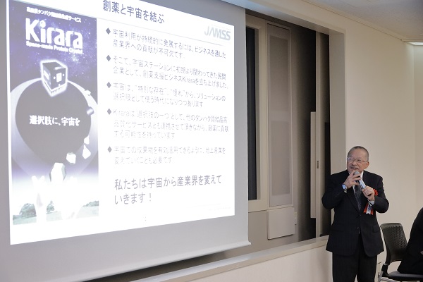 冒頭、当社社長の古藤俊一より、ISSや今後期待される商業宇宙ステーションなど、宇宙のインフラを利用して産業界の課題を解決する新時代への取り組みについて紹介致しました。