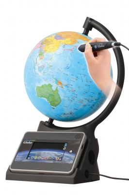 『小学館の図鑑NEOGlobe』はタブレットが連動している地球儀で、地球儀上で知りたい国を付属のペンでタッチすると、タブレットのパッドにその国の情報を表示し、音声で解説します。