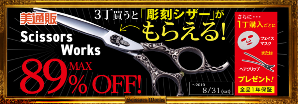 プロ向け美容材料の通信販売サイト「美通販」が、ご好評につき「SCISSORS WORKS/シザースワークス」キャンペーンを8月31日(土)まで期間延長!今なら3丁購入で彫刻シザーを1丁プレゼント!