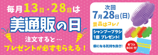 毎月13日と28日は、注文するとプレゼントが必ず貰える「美通販の日」!プロ向け美容材料の通信販売サイト「美通販」が、7月28日(日)に注文された方全員に、「シャンプーブラシ」1個をもれなくプレゼント!