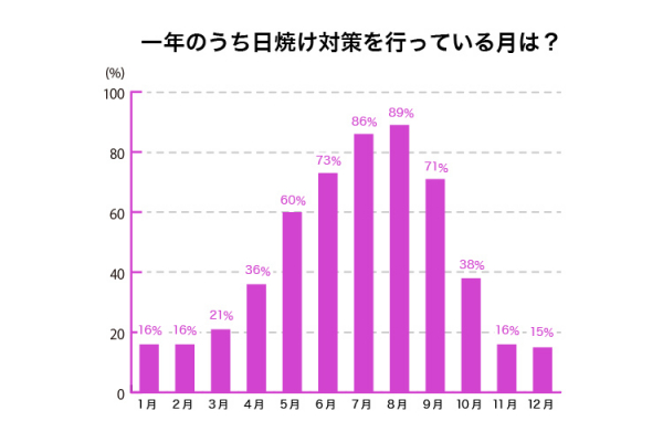 日焼け対策を行う月は、初夏から秋にかけて集中し、8月でピークに。