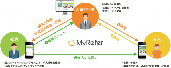 「MyRefer(マイリファー)」は、人事担当者や社員に負担をかけず社員紹介による採用を導入・促進できる、国内初のリファラル採用プラットフォームです。新卒・中途・アルバイト全ての領域で利用が可能です。2015年より500社以上に導入いただき、あらゆる規模の企業にご利用いただいております。低価格で簡単にリファラル採用を導入・活性化でき、リファラル採用の制度設計から、運用・採用成功まで企業の課題に合わせたプログラムを構築しています。「MyRefer」を導入した企業の人事は、リクルーターになってほしい社員にWeb上のマイページを配布。社員はFacebook やLINEなどのSNSを通じて、自分の知人に自社の求人や採用イベントを紹介します。求人に興味を持った知人は「MyRefer」を通じて応募し、企業の面接を受けて入社に至ります。