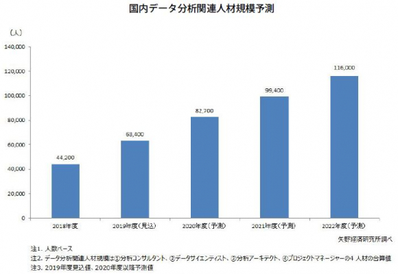 【矢野経済研究所プレスリリース】データ分析関連人材規模に関する調査を実施(2019年) 2019年度の国内データ分析関連人材規模は63,400人の見込、2022年度には116,000人に達すると予測